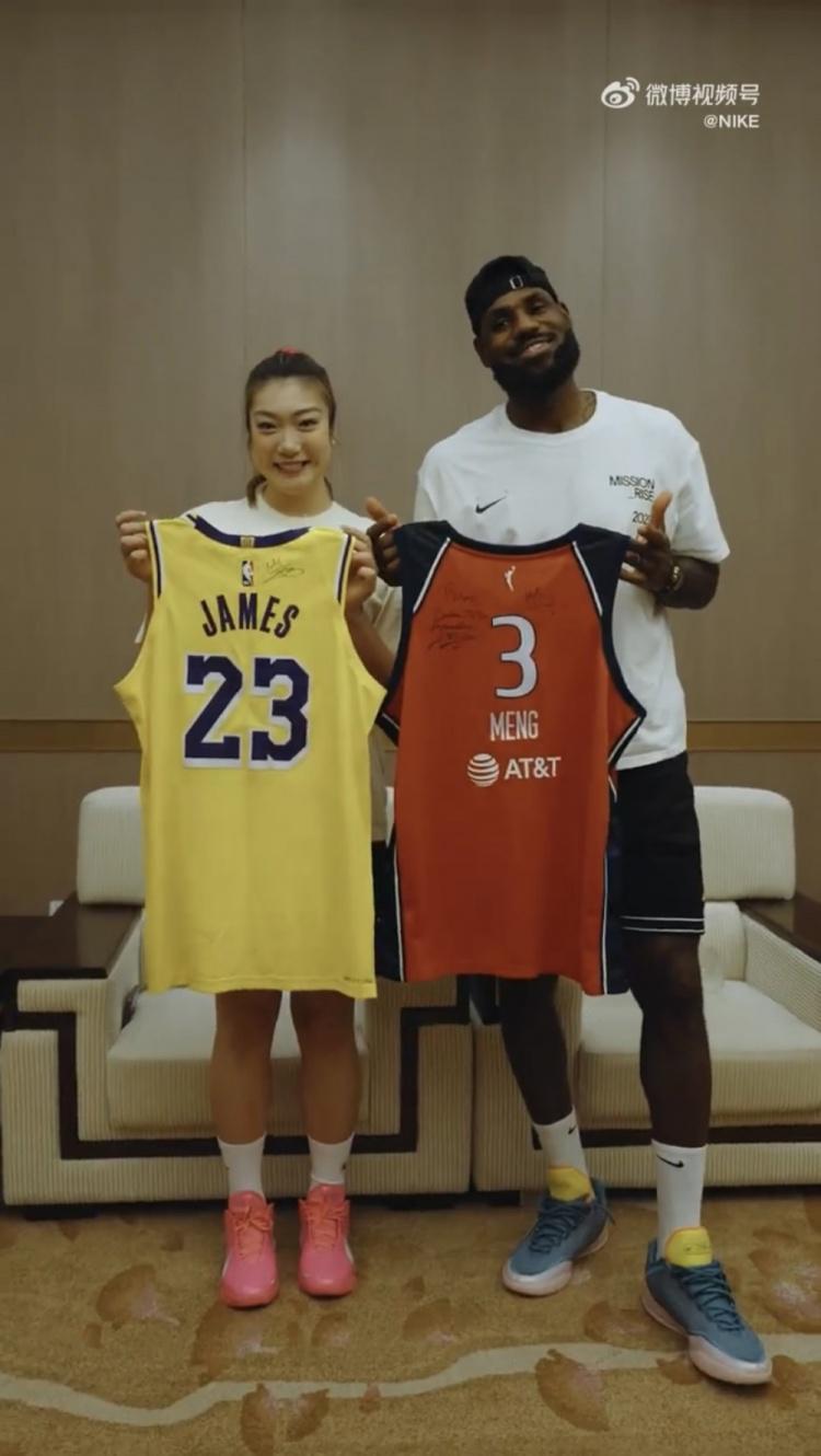 勒布朗梦!耐克官方晒昨晚李梦与詹姆斯互赠礼物并合影精彩片段